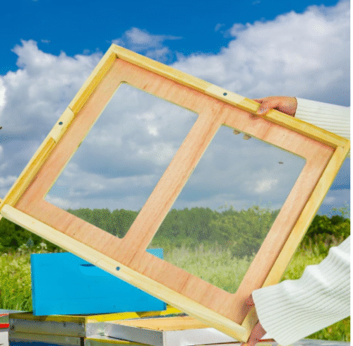 - Features a wooden frame sized to fit standard hive bodies (10-frame, 8-frame, or compatible with specific box types).